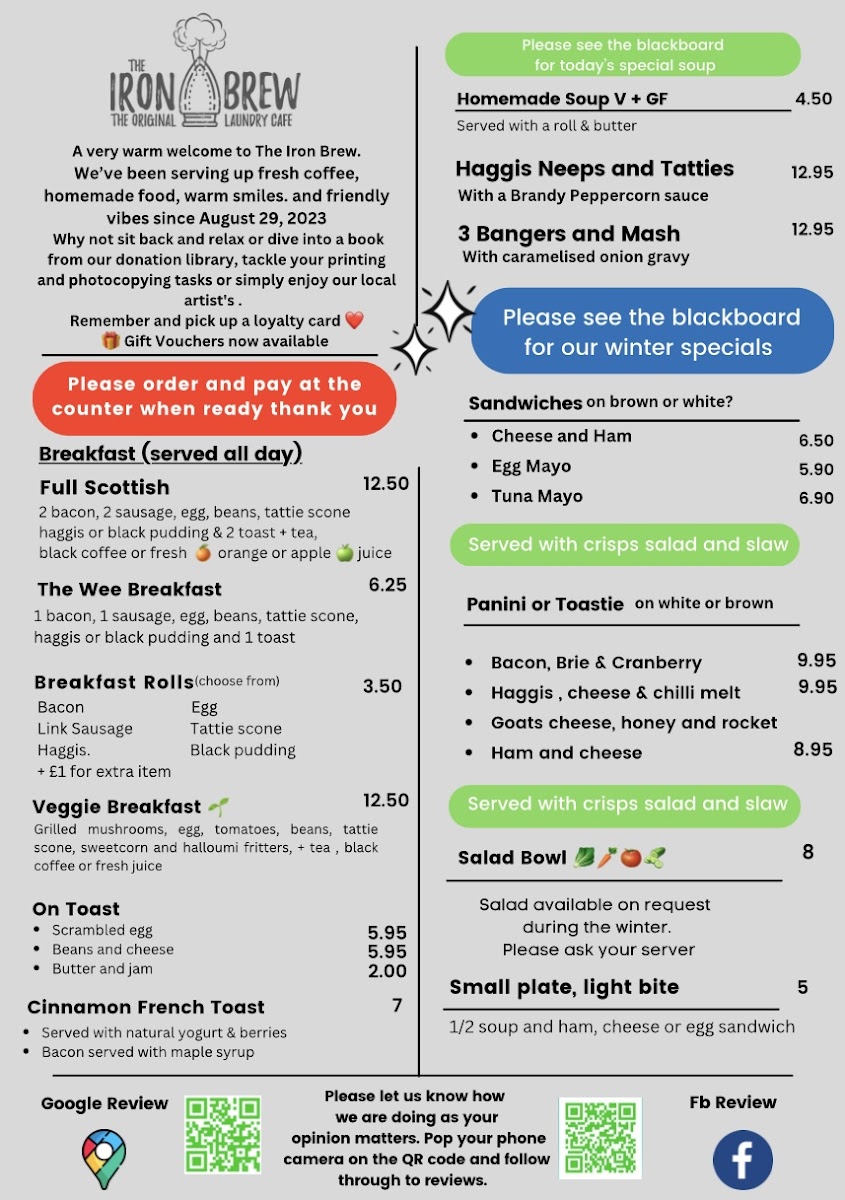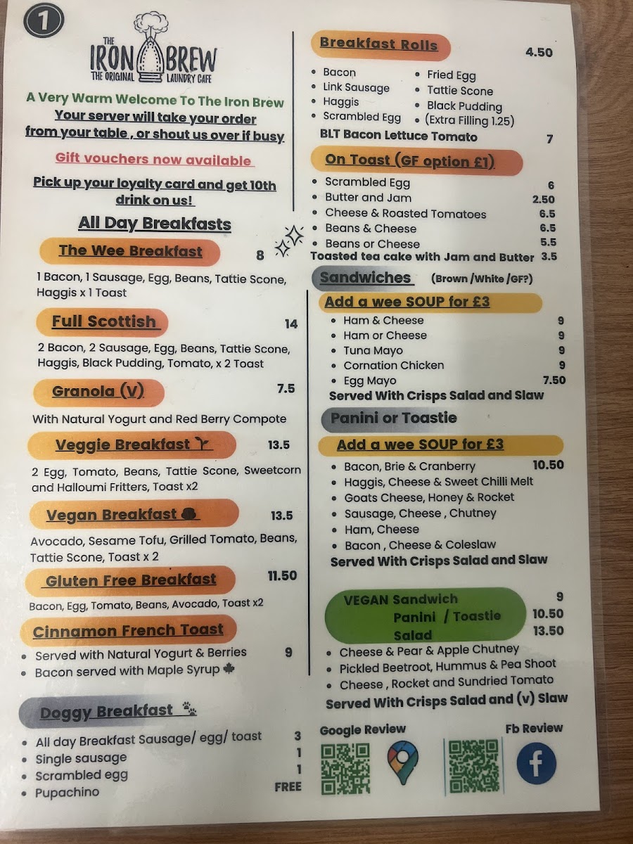 The menu at The Iron Brew is truly a unique fusion of traditional Scottish fare and contemporary twists. From hearty breakfast options to delicious lunches, the variety is impressive. One standout feature is the blend of local ingredients with innovative recipes, ensuring that every dish has a special touch. The Iron Brew's signature items, such as their famous homemade pies and freshly made soups, cater to a wide range of tastes and dietary needs.