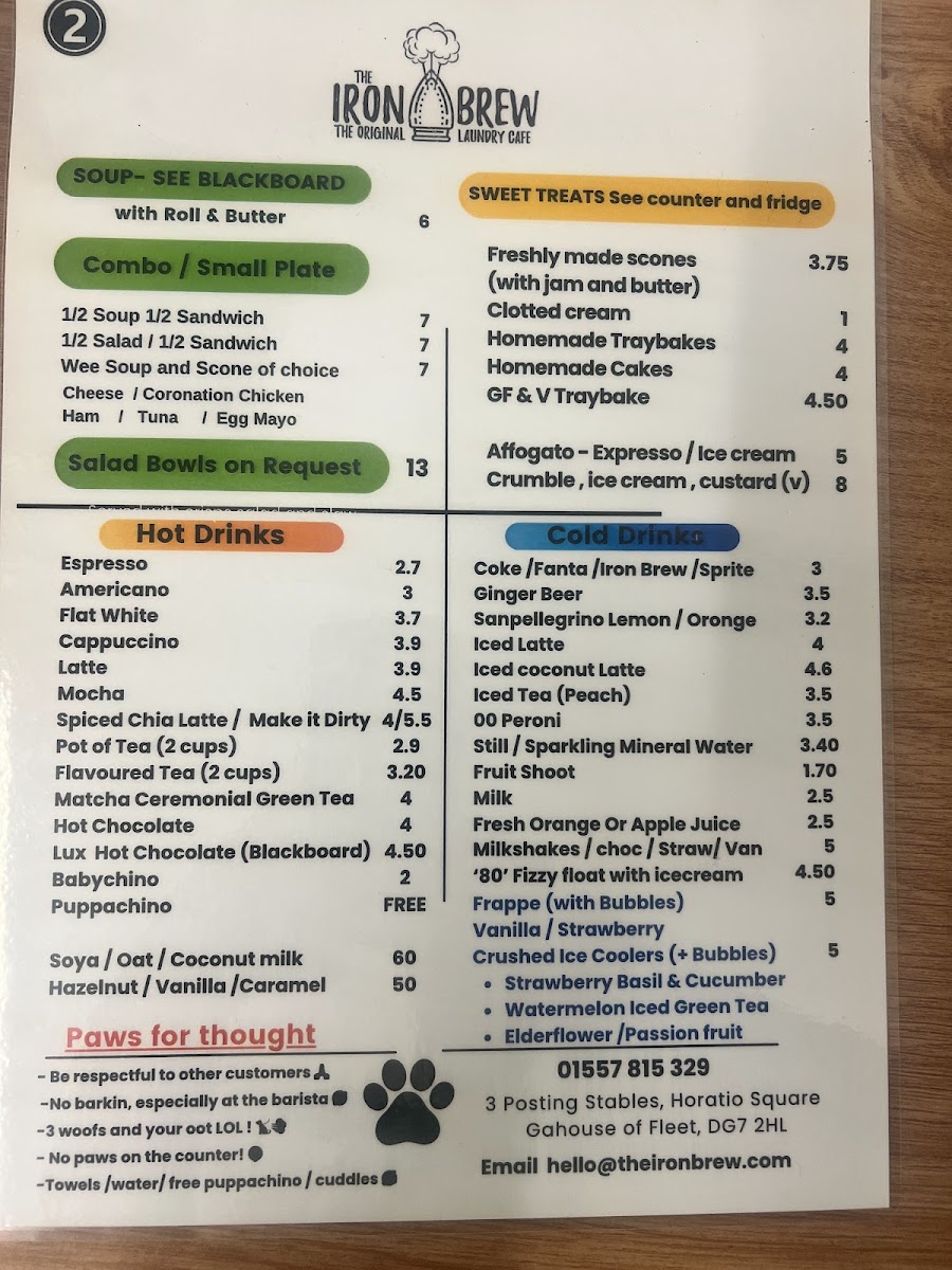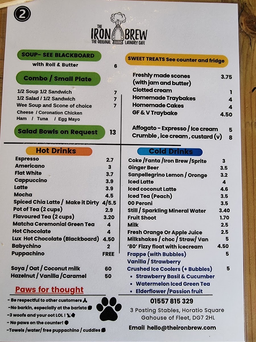 The Iron Brew Menu, located at High St, Gatehouse of Fleet, Castle Douglas DG7 2HR, United Kingdom, offers a delightful dining experience that stands out in the heart of Scotland. The atmosphere is cozy yet vibrant, perfect for those looking for a friendly, casual setting to enjoy quality food.